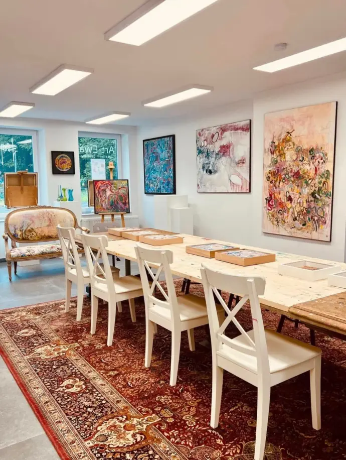 Atelier de peinture à Chaudfontaine. Les élèves exposent leurs tableaux sur des sujets différents et des techniques très diversifiées et très audacieuses. L’atelier se trouve dans la galerie du peintre.