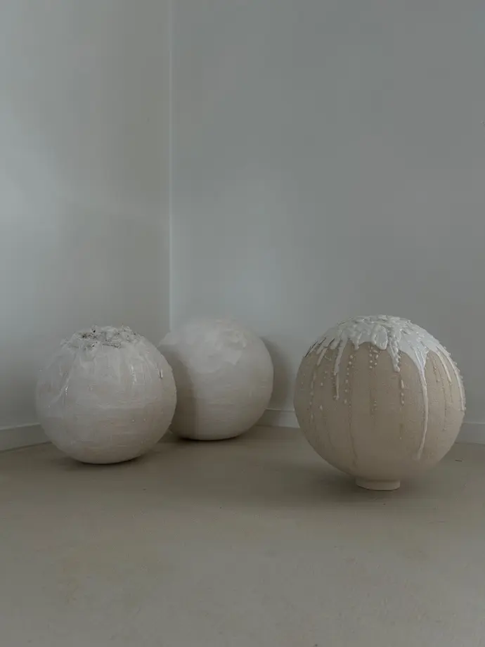 Après la fermeture de mes deux magasins de décoration, j’ai entamé une nouvelle aventure dans l’atelier maternel. Le geste juste, le contact avec la terre : une évidence. Depuis, j’explore sans relâche le grès et la porcelaine façonnés à la main. Mes pièces imposantes et pourtant aériennes revendiquent le brut, l’irrégulier, l’asymétrie.